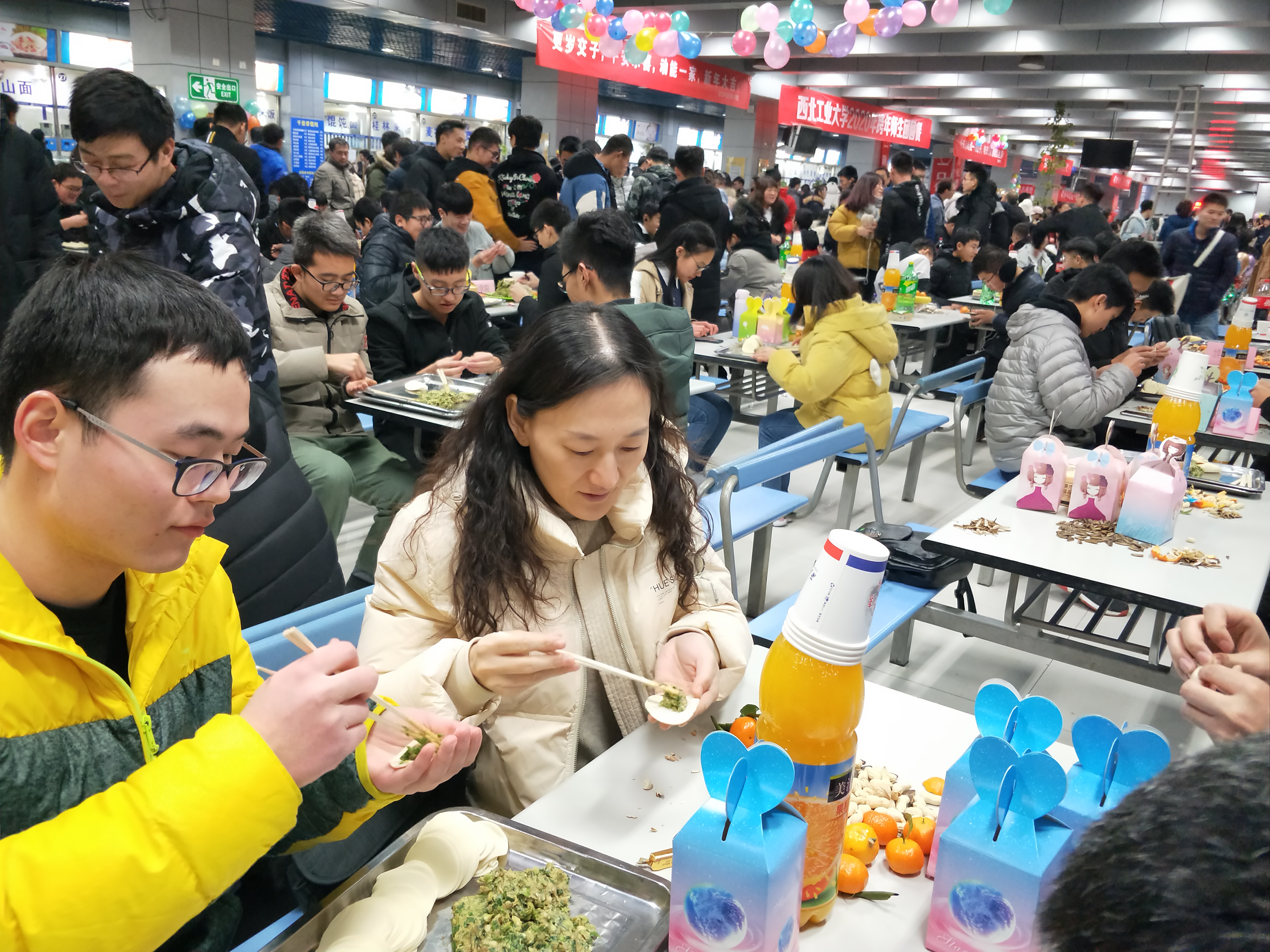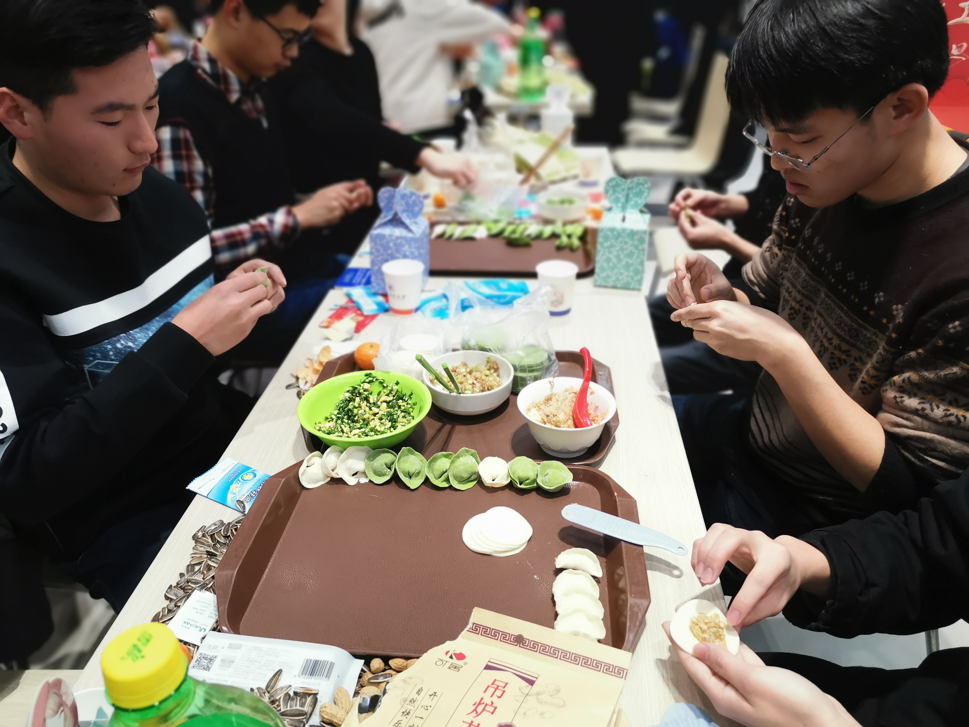 的同学们亲切交谈,表达学校对同学们的关心与爱护,了解学生心中所思所想,并对同学们送上新年祝福。同学们发挥奇思妙想,激情创作,各种形状的饺子诞生。有的饺子中包裹着硬币和花生,吃到的同学收获了大家真诚的祝福。团圆餐其乐融融,节日氛围浓厚。最后,在“包饺子大赛”、“倒念词语比赛”等形式多样的活动中,包饺子活动圆满结束。