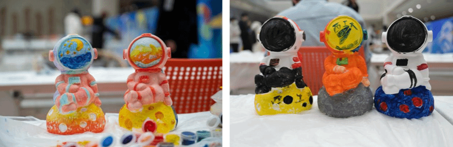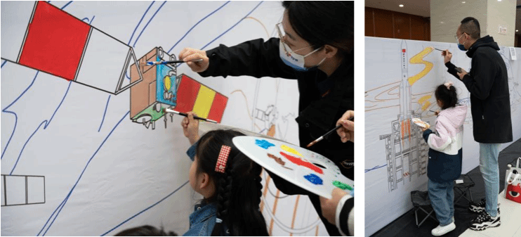 太空创想集市是航天科技文化节系列活动中的重要一项,它汇聚了航天模型彩绘、航天积木拼搭、用古诗词打开中国航天、绘制航天长卷四项精彩活动。每个活动背后都有精彩的故事,活动参与者可获得不同积分,最后凭借积分兑换精美的航天文创。
