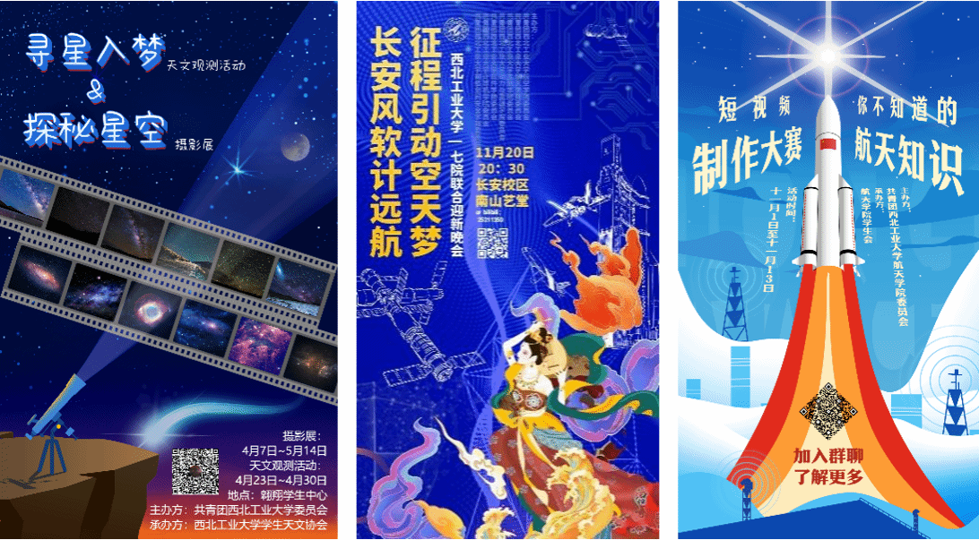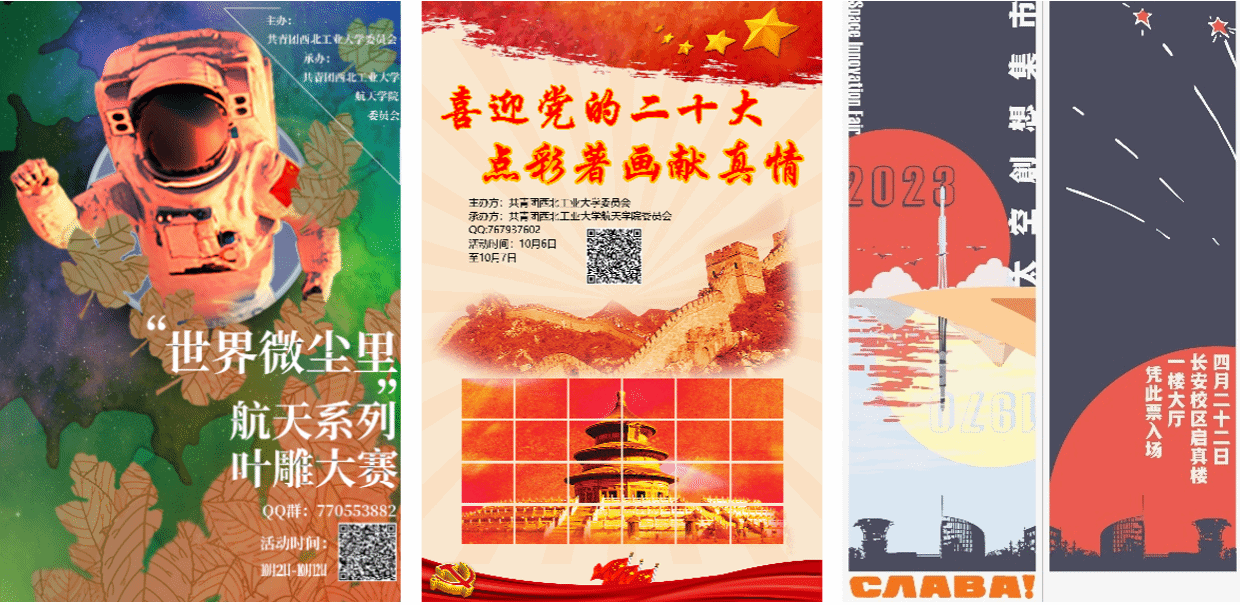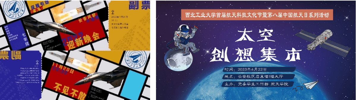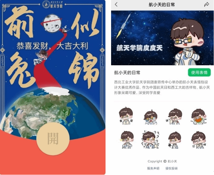 他们始终宣扬航天精神。中心在微信表情包商城上线“航小天的日常”微信表情包;结合航天特色设计春节微信红包封面;筹办西北工业大学首届航天科技文化节之太空创想集市活动,进行航天长卷线稿设计。